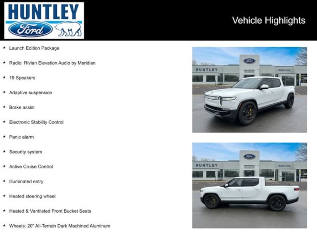 2022 Rivian R1T 19 Speakers, Active Cruise Control, Adaptive suspension, Brake assist, Electronic Stability Control, Heated & Ventilated Front Bucket Seats, Heated steering wheel, Illuminated entry, Launch Edition Package, Panic alarm, Radio: Rivian Elevation Audio by Meridian, Security system, Wheels: 20" All-Terrain Dark Machined Aluminum. Clean CARFAX.