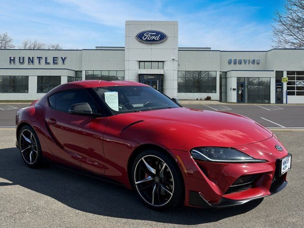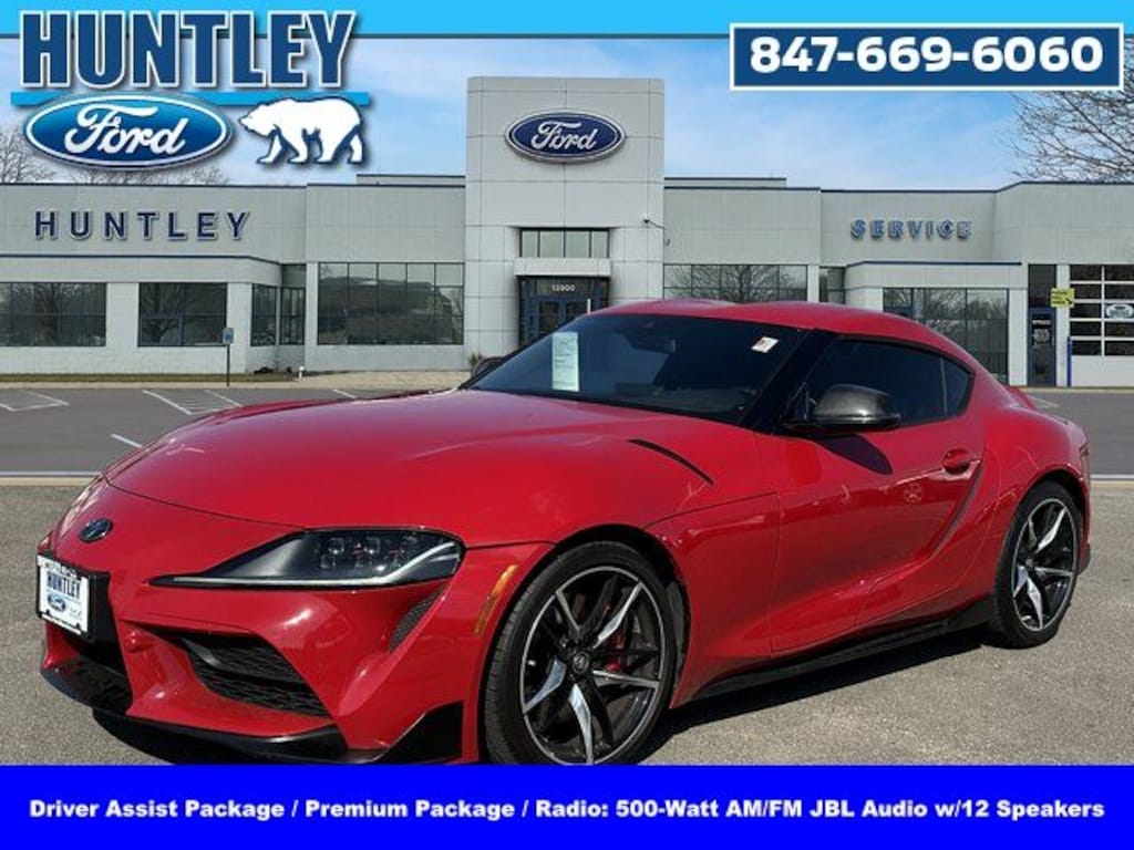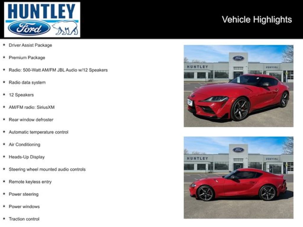 2021 Toyota Supra 12 Speakers, Adaptive Cruise Control w/Stop & Go, Air Conditioning, Alloy wheels, AM/FM radio: SiriusXM, Automatic temperature control, Blind Spot Monitor, Clearance & Back Up Sonar, Driver Assist Package, Four wheel independent suspension, Heads-Up Display, Power steering, Power windows, Premium Package, Radio data system, Radio: 500-Watt AM/FM JBL Audio w/12 Speakers, Rear Cross Traffic Alert, Rear window defroster, Red Brake Calipers, Remote keyless entry, Speed-sensing steering, Steering wheel mounted audio controls, Traction control, Wheels: 19" Forged Aluminum w/Painted Accents. Clean CARFAX.